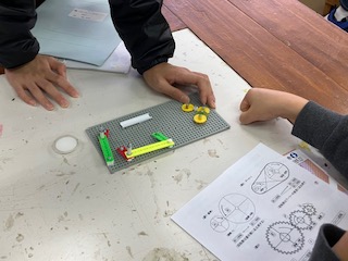 午前中は、基礎コースのみなさんが、ギアの動く仕組みや、大小のギアの組み合わせ等による動きや力の働き方などを学びました。