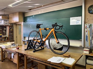 黒板前のテーブルに、どーんと登場したのは自転車。